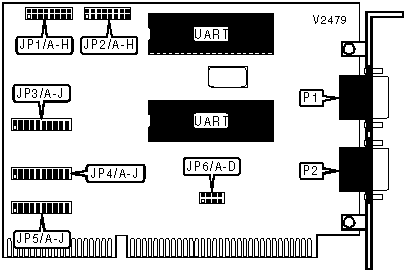Note:The settings for JP3 and JP5 are identical to JP4. JP4 sets the interrupt for port 1, JP5 sets the interrupt for port 2, and JP3 sets the common interrupt. For JP3, set identical jumpers to both JP4 and JP5. | ||||||