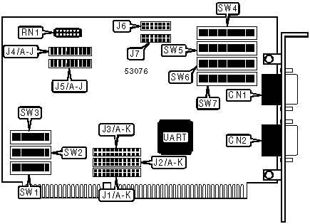Note:The settings for jumper J3 are identical to those for J2. J2 sets the interrupt for port 1, and J3 sets the interrupt for port 2. | |||||