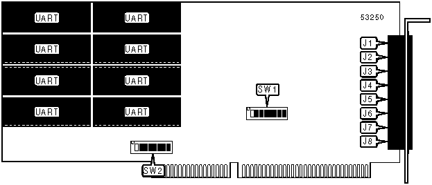Note: A total of 256 base address settings are available. The switches are a binary representation of the decimal memory addresses. SW1/8 is the Most Significant Bit and switch SW1/2 is the Least Significant Bit. The switches have the following decimal values: SW1/8=4096, SW1/7=2048, SW1/6=1024, SW1/5=512, SW1/4=256, SW1/3=128, SW1/2=64. Turn off the switches and add the values of the switches that are off to obtain the correct memory address. (Off=1, On=0)