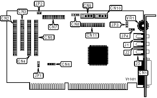 CD-ROM audio in (3), CD-ROM interface (3), game/MIDI port, IDE (AT) interface, line in, microphone in, speaker/line out, synthesis connector (2), volume, wavetable connector