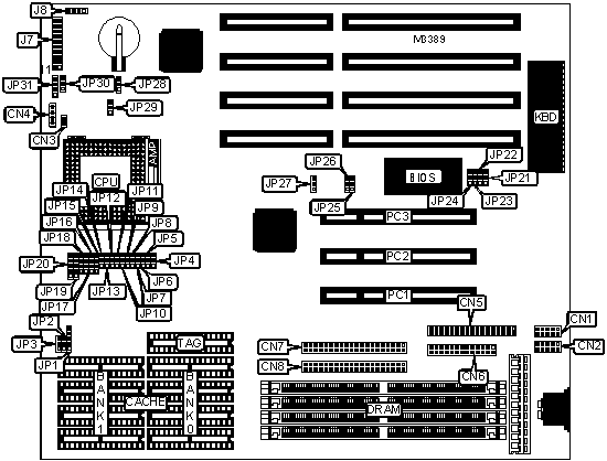 Note: Board also accepts x 32 SIMMs. The location of the banks is unidentified.