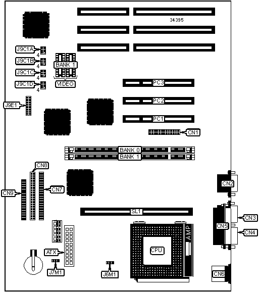 32-bit PCI slots (3), floppy drive interface, IDE interfaces (2), parallel port, PS/2 mouse port, serial ports (2), VESA feature connector, VGA port, cache slot, ATX power connector
