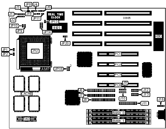 Note: Board accepts EDO memory. Board also accepts x 32 SIMMs. Banks are interchangeable. | ||