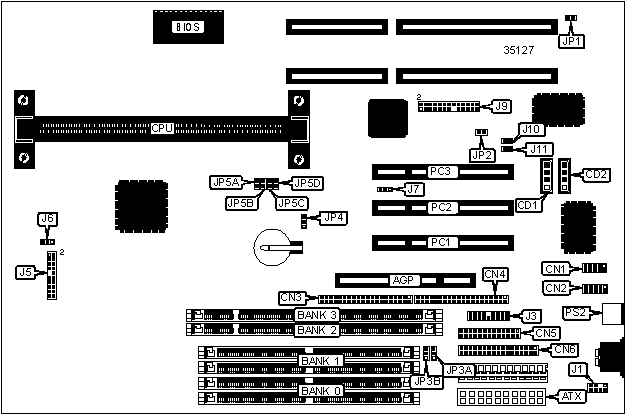 32-bit PCI slots (3), game/sound connector, Audio in - CD-ROM (2), floppy drive interface, IDE interfaces (2), parallel port, PS/2 mouse port, serial ports (2), AGP slot, ATX power connector, ATX form card connector, green PC connector
