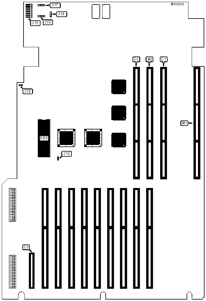 Proprietary external CPU/cache card connector, proprietary external keyboard/mouse connector, proprietary external memory card connectors (2), proprietary external local bus connector