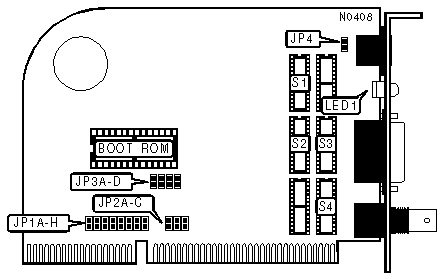Note:S1, S2, and S3 are sockets for a transformer chip while S4 is a socket for a Cabling Option Resistor Kit (CORK). To choose a cable type insert the appropriate chips into the appropriate sockets. All cards on the network segment must use the same type of coaxial cable.